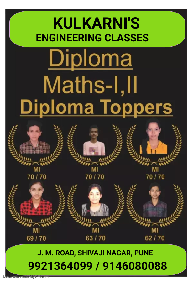 Best engineering classes in Pune, Best engineering tutorial, diploma engineering classes in Shivaji Nagar, Pune Being one of the best engineering classes in Pune for Mechanical Engineering, Civil Engineering and all other branches, it gives us immense pleasure to share with you one of our achievements out of many and many more to come. Showing Some of our toppers of Diploma Maths students