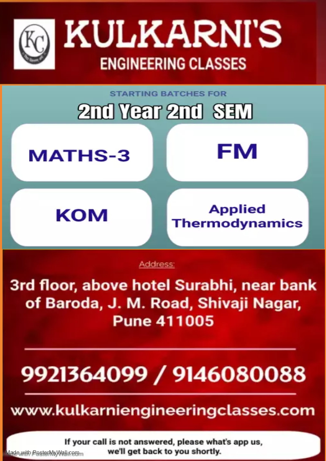 Kulkarni's Engineering Classes, No.1 students'-oriented engineering classes in Pune, is having batches for various subjects for engineering degree subjects and diploma subjects. Classes starting for All subjects of branches of Mechanical Engineering, Computer Engineering, E & TC Engineering, Civil Engineering, IT Engineering. For more info call or what;s app us. FREE DEMO LECTURES FOR ALL STUDENTS WHENEVER THEY JOIN.